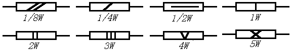 不同的电路对电阻的误差有不同的要求。一般电子电路,采用Ⅰ级或者Ⅱ级就可以了。在电路中,电阻的阻值,一般都标注标称值。如果不是标称值,可以根据电路要求,选择和它相近的标称电阻。 3. 电阻的额定功率。当电流通过电阻的时候,电阻由于消耗功率而发热。如果电阻发热的功率大于它能承受的功率,电阻就会烧坏。电阻长时间工作时允许消耗的最大功率叫做额定功率。电阻消耗的功率可以由电功率公式:  计算出来,P表示电阻消耗的功率,U是电阻两端的电压,I是通过电阻的电流,R是电阻的阻值。 电阻的额定功率也有标称值,常用的有1/8、1/4、1/2、1、2、3、5、10、20瓦等。在电路图中,常用图2所示的符号来表示电阻的标称功率。选用电阻的时候,要留一定的余量,选标称功率比实际消耗的功率大一些的电阻。比如实际负荷1/4瓦,可以选用1/2瓦的电阻,实际负荷3瓦,可以选用5瓦的电阻。